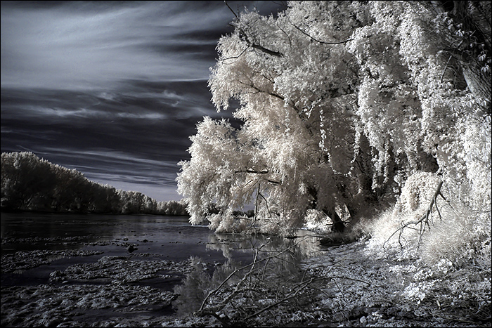 Photo de du fleuve Garonne aux abords de Toulouse, avec un flux d'eau très faible (en été). La technique utilisée est une colorisation Infrarouge.